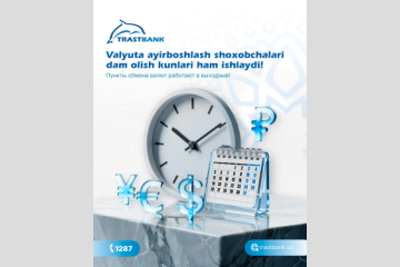 Yurtdoshlarimiz va mijozlarimizning bank xizmatlaridan foydalanishlarida qulaylik yaratish maqsadida joriy yilning 28-29-iyun kunlari soat 9:00 dan 16:00 ga qadar “Trastbank” XAB Amaliyot boshqarmasi, “Bektemir”, “Darxon”, “Yakkasaroy” va “Toshkent” bank xizmatlari ofislari qoshidagi Valyuta ayirboshlash shoxobchalari ish faoliyatida bo‘lishini ma’lum qilamiz.
