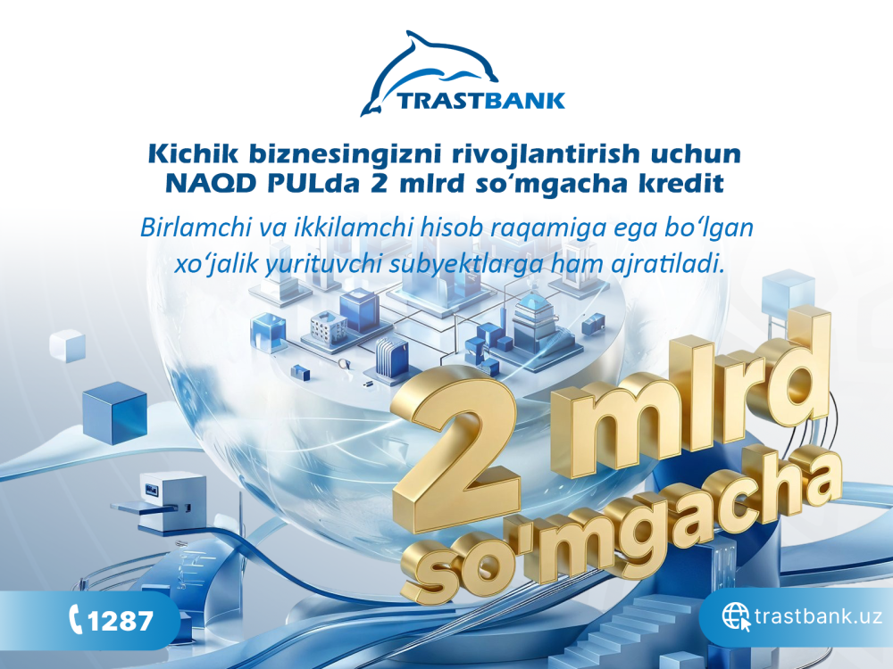 Tadbirkorlikni yo‘lga qo‘yish yoki mavjud biznesni kengaytirish, aylanma mablag‘ni to‘ldirish uchun ishonchli moliyaviy yechim kerakmi? “Trastbank” 2 mlrd so‘mgacha kredit taklif qiladi. Undan birlamchi va ikkilamchi hisob raqamiga ega tadbirkorlik subyektlari foydalanishlari mumkin.